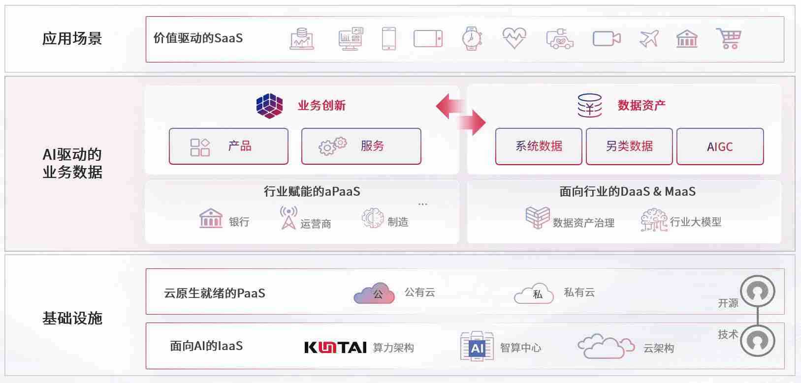 数字时代,,,,围绕企业数字化转型的关键要素,,,尊龙旗舰厅数码开创性的提出数云融合战略和技术体系框架,,着力在云原生、、数字原生、、、、AI原生和信创产业上架构产品和服务能力,,,为处在不同数字化转型阶段的快消零售、、、、汽车、、、、金融、、医疗、、政企、、、、教育、、运营商等行业客户提供泛在的敏捷IT能力和融合的数据驱动能力,,构建跨界融合创新的数字业务场景和新业务模式,,,助力企业级客户建立面向未来的核心能力和竞争优势,,全面推动社会的数字化、、、、智能化转型升级。。。。